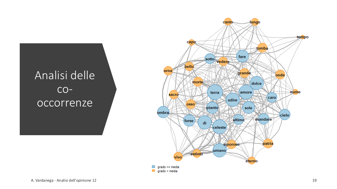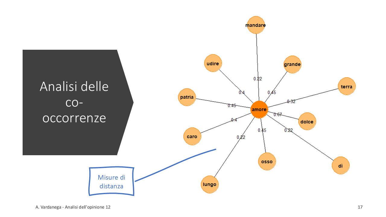 La statistica testuale si basa sull’analisi e il trattamento delle co-occorrenze fra parole. Ma cosa si intende per “co-occorrenza” o “vicinanza” di due parole? Nel nostro esempio, le parole “ombra” del primo verso e “risplenderà” dell’ultimo co-occorrono? Sono vicine o sono lontane?