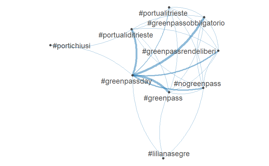 graph_from_data_frame(df, # non orientato directed = F) %>% # semplificato simplify() </code <code rsplus> IGRAPH f0bcd60 UNW- 10 42 -- + attr: name (v/c), weight (e/n) + edges from f0bcd60 (vertex names): [1] #greenpass --#greenpassday #greenpass --#greenpassrendeliberi [3] #greenpass --#greenpassobbligatorio #greenpass --#portichiusi [5] #greenpass --#portualiditrieste #greenpass --#lilianasegre [7] #greenpass --#nogreenpass #greenpass --#libertà [9] #greenpass --#portualitrieste #greenpassday--#greenpassrendeliberi [11] #greenpassday--#greenpassobbligatorio #greenpassday--#portichiusi [13] #greenpassday--#portualiditrieste #greenpassday--#lilianasegre [15] #greenpassday--#nogreenpass #greenpassday--#libertà + ... omitted several edges