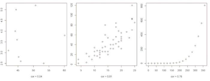 Nel terzo grafico, ad esempio, il coefficiente di correlazione sottostima la relazione fra le due variabili (i punti sono perfettamente allineati, ma non formano una retta).