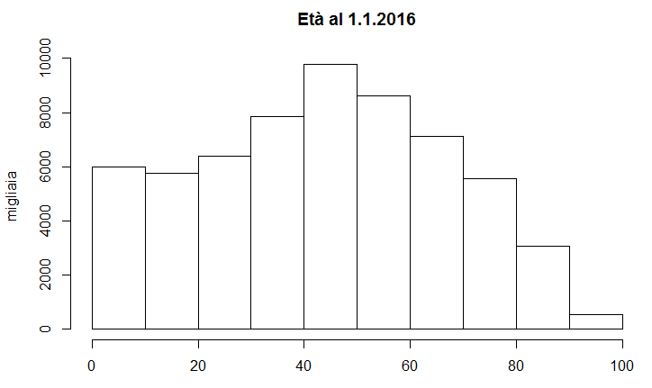 wtd.hist(Istat16$Età, weight = Istat16$Totale/1000, main = "Età al 1.1.2016", xlab = "", ylab = "migliaia")