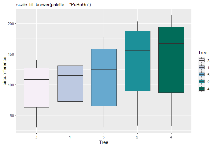 Orange %>% ggplot(aes(Tree, circumference)) + geom_boxplot(aes(fill = Tree)) + scale_fill_brewer(palette = "PuBuGn")