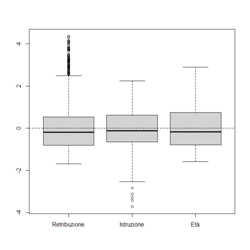 # dati data(SLID, package = "carData") # boxplot con etichette boxplot(scale(SLID[1:3]), names = c("Retribuzione", "Istruzione", "Età")) # retta della media abline(h = 0, # media = 0 lty = 2)