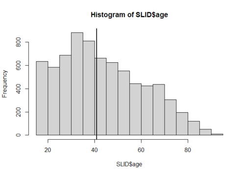 # istogramma hist(SLID$age) # retta della mediana abline(v = median(SLID$age), # mediana lwd = 2)