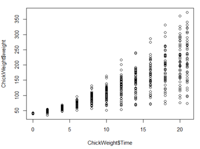 plot(ChickWeight$Time,ChickWeight$weight)