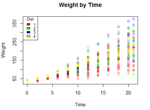 # scegliamo i simboli da utilizzare per i livelli di ChickWeight$Diet punti<-c(0,1,2,6) # grafico plot(ChickWeight$Time,ChickWeight$weight, main="Weight by Time", xlab="Time", ylab="Weight", pch = punti[ChickWeight$Diet]) # legenda legend("topleft", title="Diet", cex = 0.8, legend=levels(ChickWeight$Diet), pch=punti)